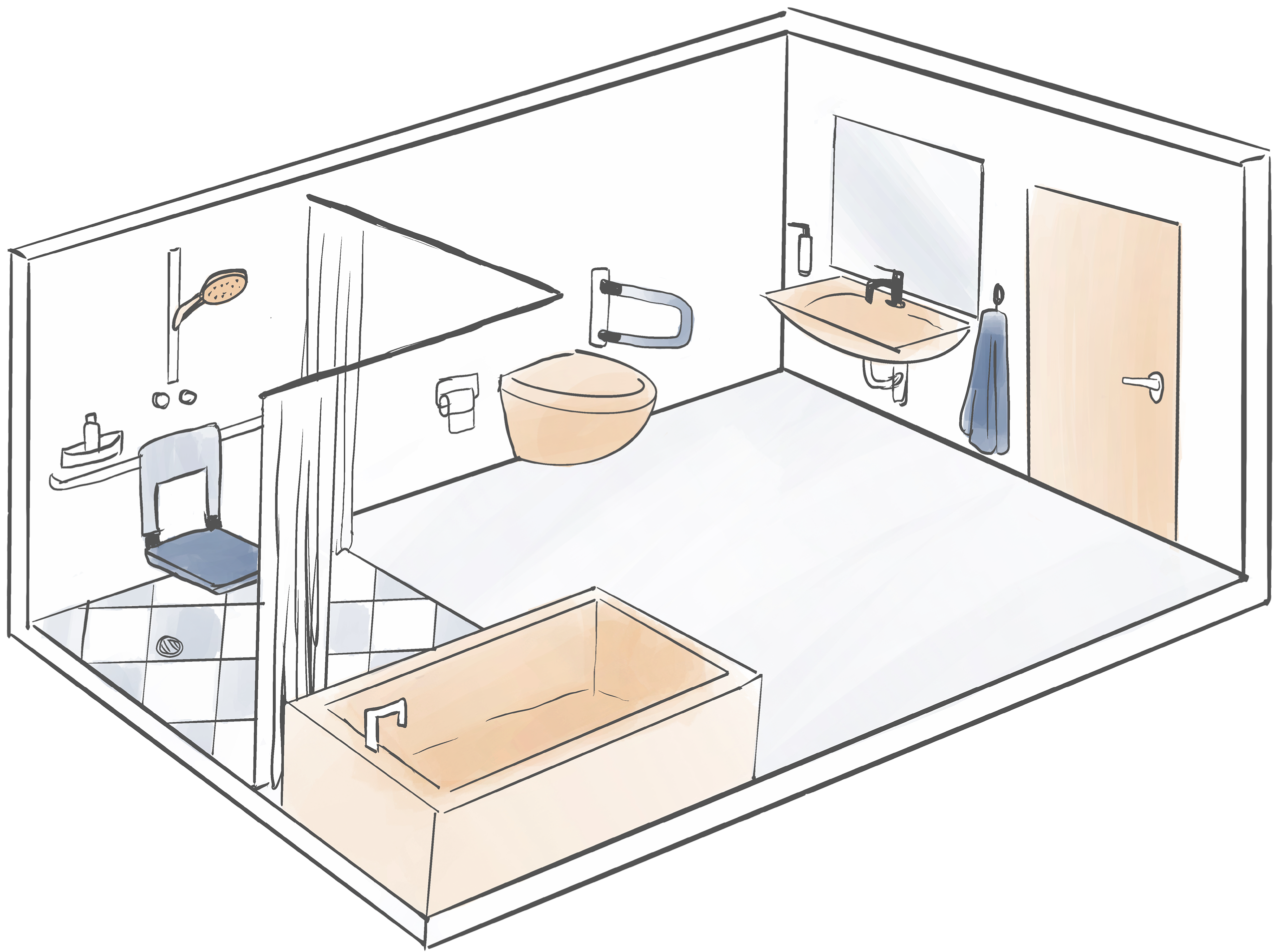 Griffe im Bad bieten Halt, besonders in der Dusche, Badewanne, am Waschtisch und WC. Duschhaltestangen können Ablagekörbe oder klappbare Sitze aufnehmen. Stützklappgriffe am WC erleichtern das Aufstehen und Hinsetzen und sind auch mit nassen Händen gut greifbar.